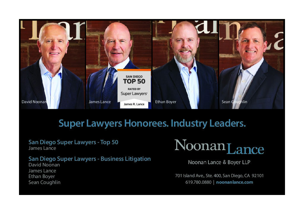 Founded in 1991, Super Lawyers honors the top 5% of attorneys each year based on peer nominations, evaluations and independent research. NoonanLance lawyers have been consistently recognized by Super Lawyers over the years, in the Top 50 and Top 10 San Diego Super Lawyers lists and for Business Litigation.